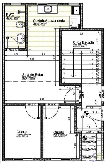 Apartamento possui 33,23 m² de área construída e oferece 2 quartos, banheiro social, sala de TV, cozinha e lavanderia.